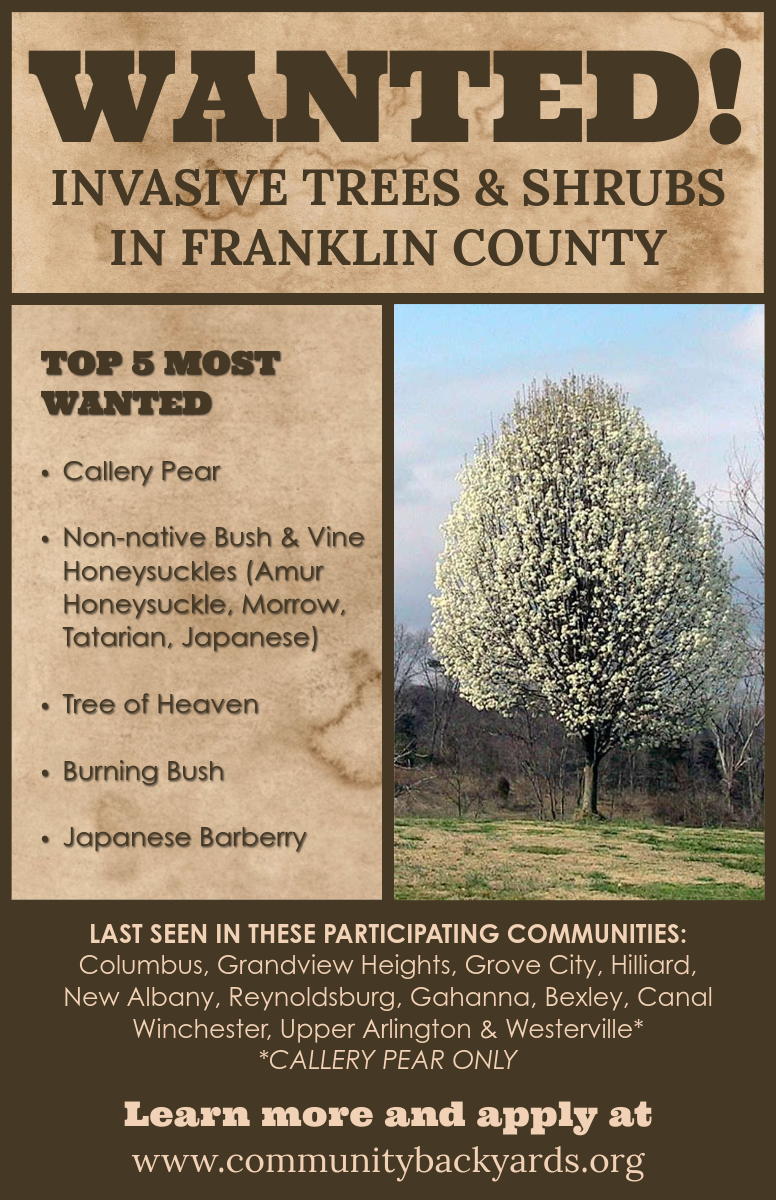 Residents of participating communities can remove an invasive tree or shrub and get a reimbursement towards replacing it with a new native tree or shrub. With this program, we want residents to learn about and remove invasive plants in our communities and encourage them to plant new native trees and shrubs instead.Thank you to the City of New Albany who helped us pilot this program in 2024. In 2026, we are excited to offer this program for another year with more participating communities!